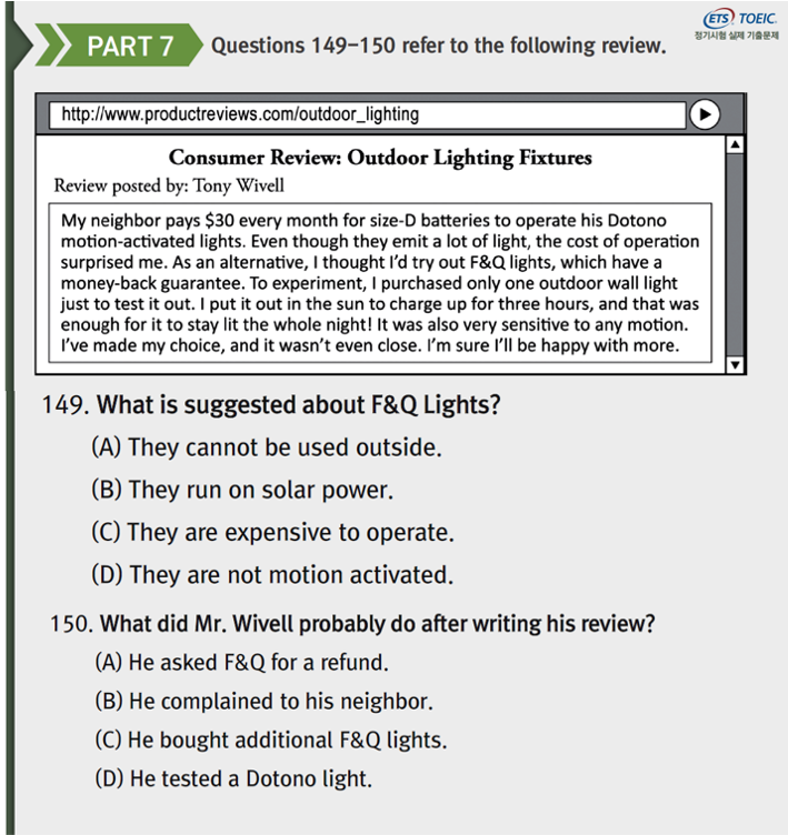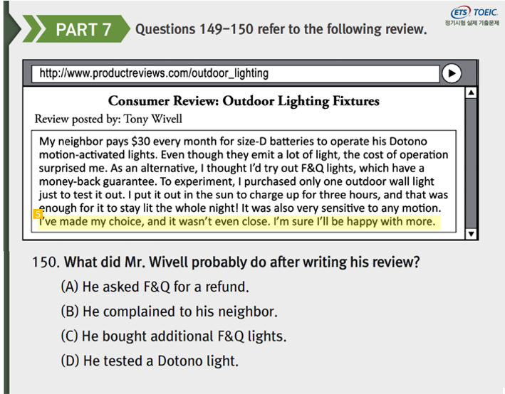 이번 문제는 이후의 상황을 추측해야 하니, 본문의 전반적인 내용을 이해하고 답을 찾는 것이 중요하겠지? 마지막 문장 ‘I’m sure I’ll happy with more.’로 같은 제품이 몇 개 더 있으면 행복할 것이라고 했으니, 정답은 추가적으로 F&Q의 전구를 샀다는 (C)가 되겠구먼. 보기 (A),(B),(C)는 F&Q 전구에 대해 긍정적이었던 본문과는 상반되는 내용이니 헷갈려서는 안 되겠지?