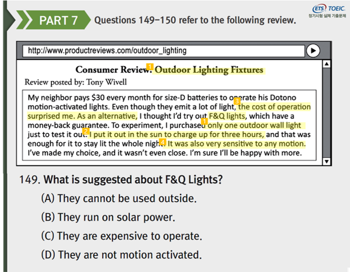 두 번째 문장에서 비용에 대한 이야기가 나오고, ‘the cost of operation surprised me’라는 문장으로 비용 대비 작동에 대한 가성비가 낮았다는 내용을 확인할 수 있지. 이 보기(C)의 비싸다는 내용은 이웃이 샀던 ‘Dotono motion-activated lights’라는 것을 알 수 있다네. 이렇게 두 상품이 비교되는 내용에서는 보기의 문장으로 헷갈리지 않도록 조심하게나!