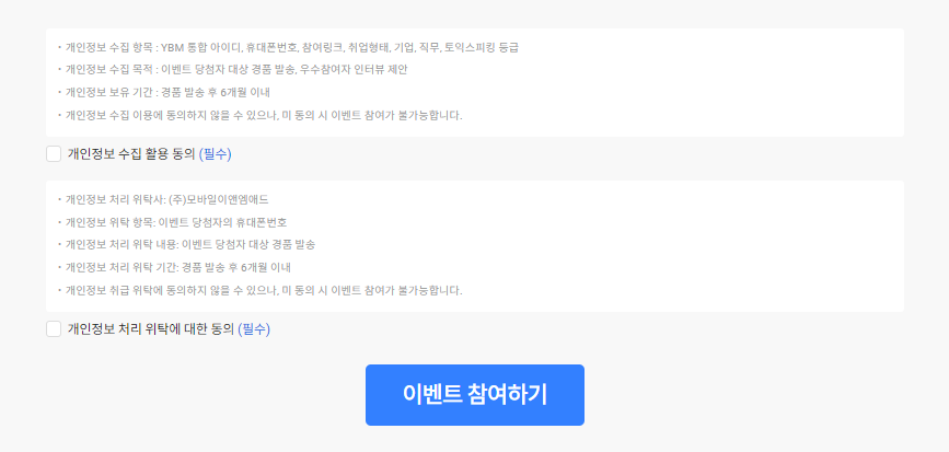 마지막으로 개인정보 수집 활용, 위탁에 대한 동의에 체크한 후 이벤트 참여하기 버튼을 누르면 참여 끝! 개인정보 수집 이용에 동의하지 않을 수 있으나, 동의하지 않을 시에는 이벤트 참여가 불가능합니다.
