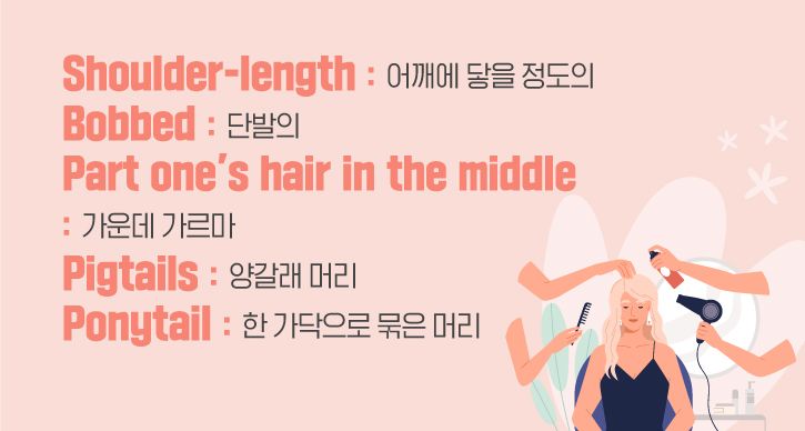 다음은 머리 길이∙스타일과 관련된 영어 표현을 살펴보겠습니다. 먼저, ‘Shoulder-length’는 어깨까지 오는 머리 길이를 나타냅니다. 이 길이는 편안하면서도 세련된 분위기를 연출하기에 적당하죠. ‘Bobbed’는 머리 길이를 어깨 높이 위로 자르는 것을 의미하는데요. 이는 ‘단발의’라는 뜻을 갖고 있습니다. 또한, 머리 스타일을 정리할 때 가르마의 방향도 중요한데요. 머리를 정중앙에서 가르는 스타일의 가운데 가르마는 ‘Part one's hair in the middle’이라고 합니다. 때문에 가운데로 가르마를 타고 싶다면, ‘Can you part my hair in the middle?(가르마를 가운데로 타줄 수 있나요?)’이라고 얘기해 볼 수 있습니다!