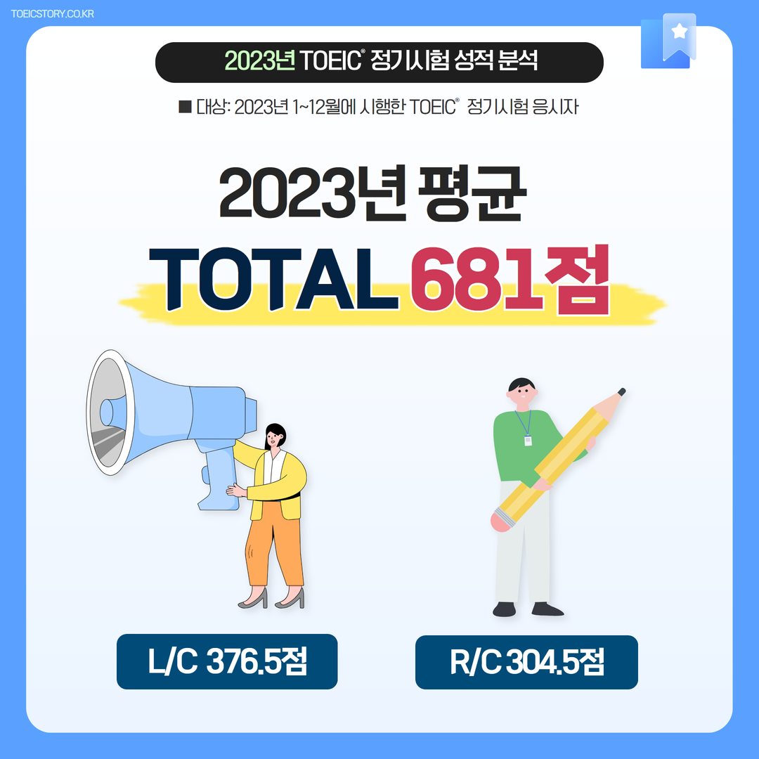 2023년 토익 평균 성적은 전년(2022년) 평균 성적인 679점 대비, 681점으로 2점 상승했습니다. 짝짝짝!