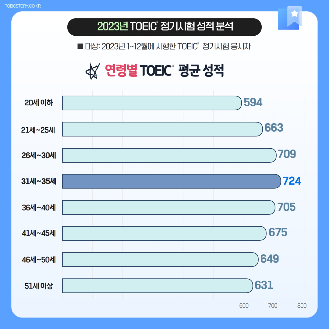 확인 결과, 2023년 연령별 토익 평균 성적은 '31세~35세'가 724점으로 가장 높았습니다. 2022년(713점)과 동일하게 가장 높은 결과이지만, 평균 성적은 11점 상승했습니다!