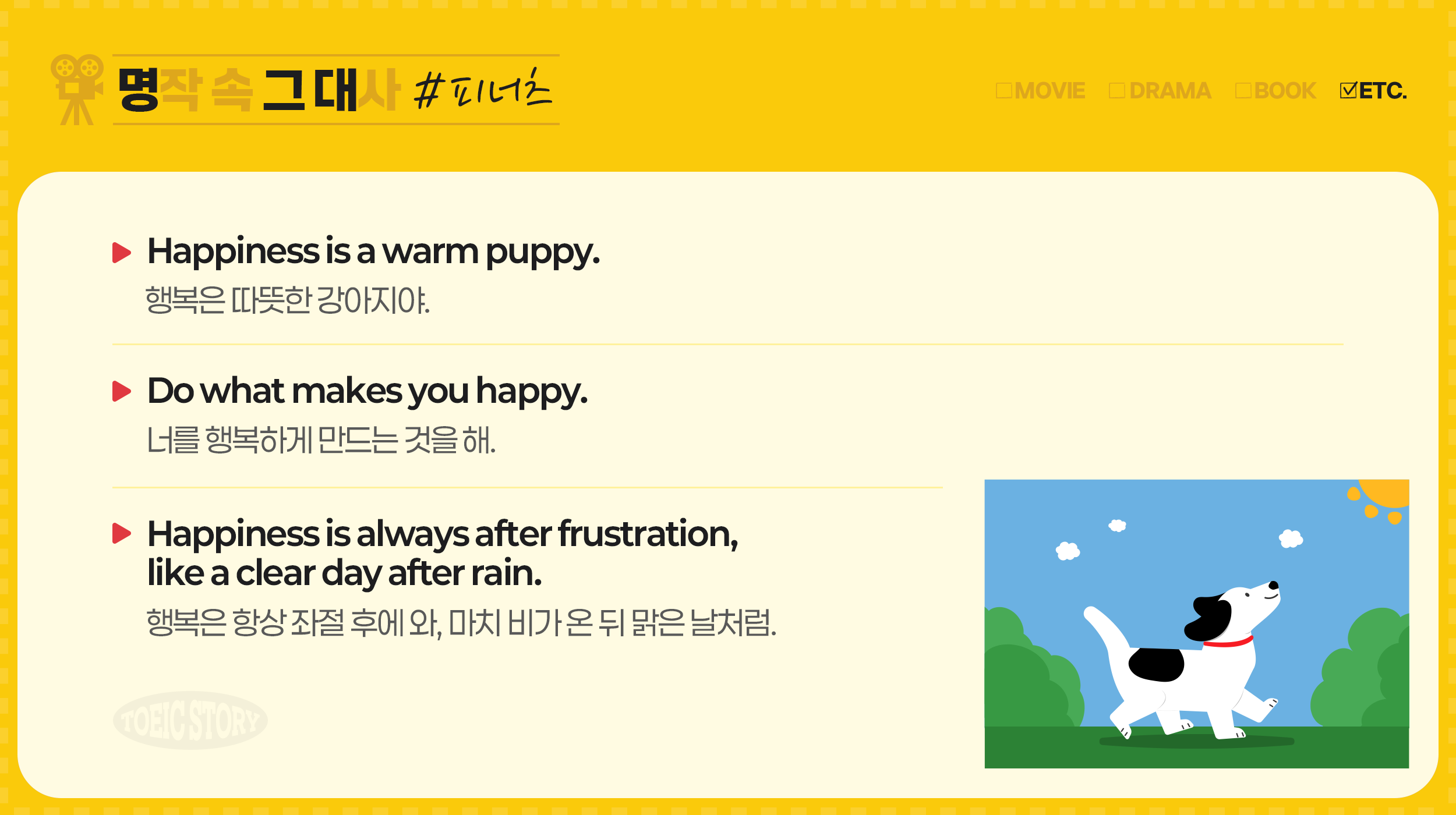 오늘은 <피너츠> 속 따뜻한 명대사들을 통해 영어 표현을 배워보았습니다. 위로와 공감이 필요한 순간에, 짧은 문장 하나가 마음을 어루만져주기도 하죠. 영어 표현을 배울 뿐 아니라 삶의 태도까지 돌아보게 만드는 명작이 아닐까요? <토익스토리>는 언제나 여러분의 행복과 밝게 빛날 인생을 응원하며, 여기서 이만 인사드리겠습니다!
