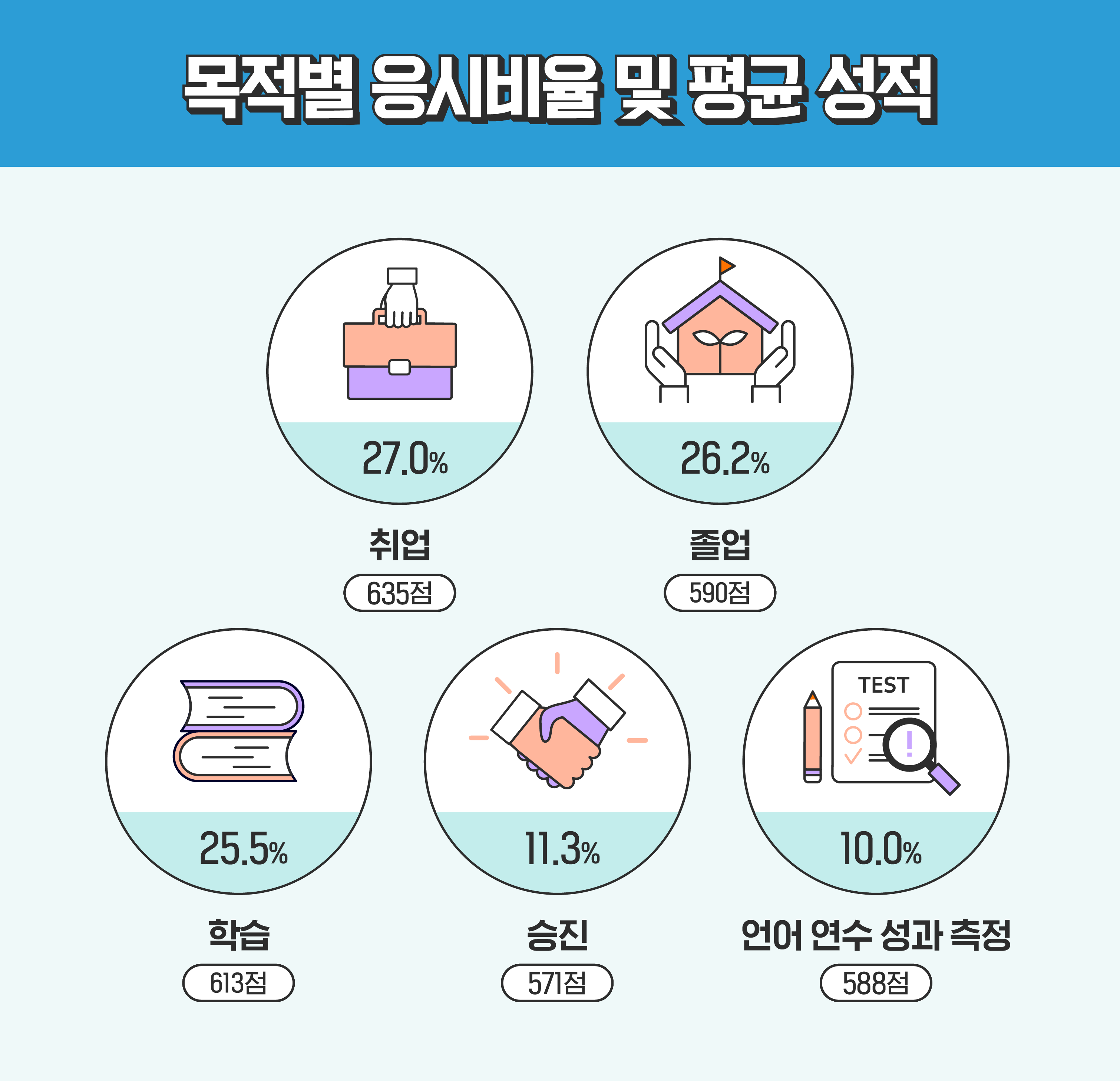 2023년과 비교하면 ‘학습’과 ‘졸업’을 목적으로 한 응시 비율은 소폭 감소한 반면, ‘취업’을 목적으로 한 응시 비율은 24.9%에서 27%로 상승했는데요. 이는 글로벌 고용 시장의 회복 흐름과 함께 TOEIC의 역할이 계속 강조되고 있음을 확인해 볼 수 있죠.