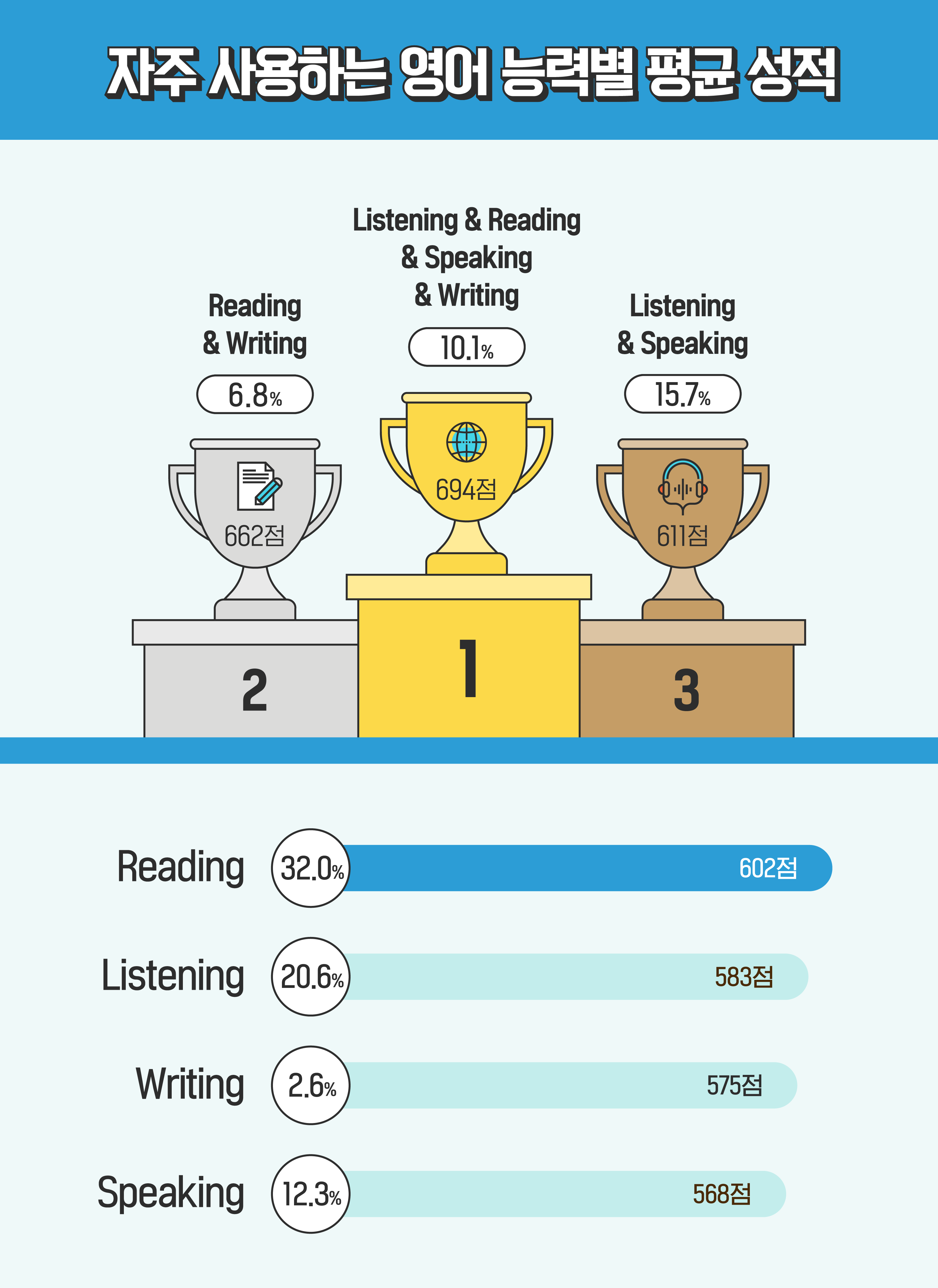 또한 ‘듣기(Listening)’를 중시한 응답자의 비율은 14%(562점), ‘읽기 & 쓰기(Reading & Writing)’는 5.5%(619점), ‘쓰기(Writing)’는 1.8%(569점)로 확인됐습니다.