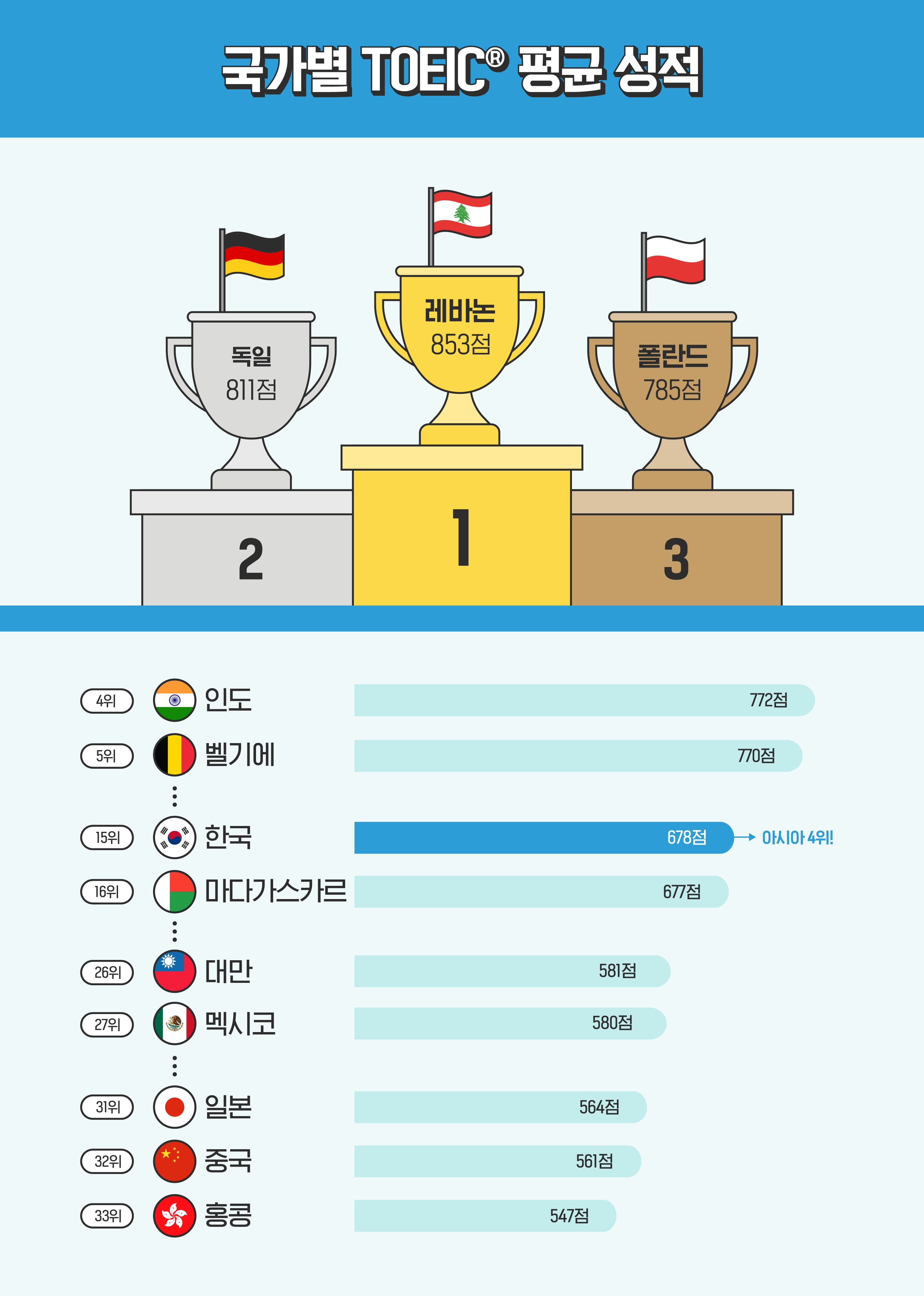 TOEIC 개발사인 미국 ETS가 전 세계 TOEIC 응시자들의 2024년 성적 데이터를 발표했습니다. 이번 자료는 국가별 평균 성적은 물론, 시험 응시 목적 등 다양한 정보가 담겨 있어 전 세계 영어 실력의 흐름을 가늠할 수 있는 지표로 주목받고 있는데요. 특히 영어 능력이 취업과 승진에 영향을 미치는 국내 환경에서는 각국의 성적 수준을 비교해 보는 것만으로도 큰 도움을 받을 수 있죠. 그렇다면 2024년, 세계 각국의 TOEIC 평균 성적은 어떻게 나타났을까요? 지금 바로 살펴보시죠!