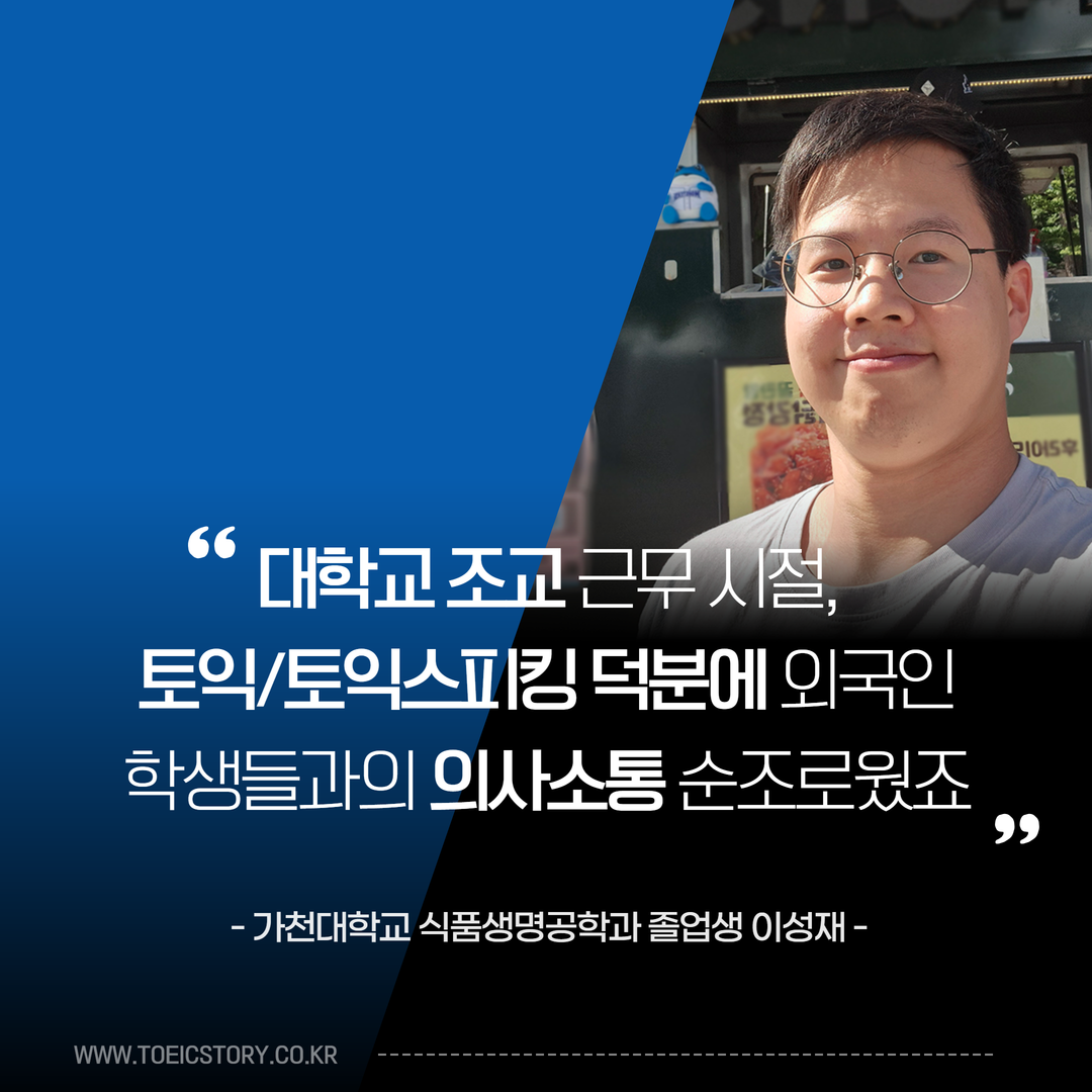 안녕하세요! 가천대학교 식품생명공학과를 졸업한 이성재입니다. 대학 재학 중부터 토익과 토익스피킹을 꾸준히 준비해 왔고, 졸업 후에도 취업을 목표로 응시했습니다. 현재 졸업한 대학에서 2년간 학사 조교로서 근무를 마치고 다시 취업 준비 중입니다.
