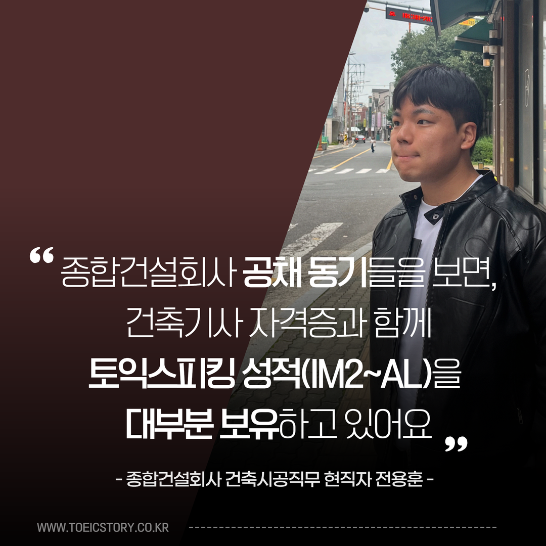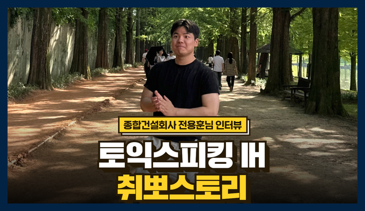 얼마 전, <토익스토리>에게 한 건의 인터뷰이 지원서가 도착했습니다. 바로 종합건설회사 건축시공직무 취업을 준비하고 있던 전용훈 님이었는데요. 토익스피킹 IH의 성적으로 삼성그룹을 포함해 많은 대기업, 중견기업 등에 서류 합격을 이뤄냈고 꿈을 향해 달려가고 계셨죠. 그런데 하나 더 기쁜 소식이 전해졌습니다. ✉️ 원하는 직무로 당당하게 취업에 성공하셨다는 소식!
