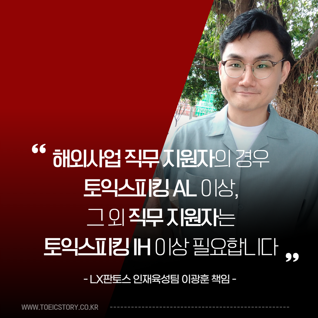 글로벌 사업을 확장하는 기업이 늘어나면서 사내 영어 능력은 선택이 아닌 필수가 되어 가고 있습니다. 글로벌 종합물류기업인 LX판토스도 그러한데요. <토익스토리>는 LX판토스 인재육성팀에서 글로벌 교육을 담당하고 있는 이광훈 책임님을 만나 이야기를 나눠봤습니다. LX판토스는 거의 매주 사내 토익스피킹 시험을 운영하고 있고, 입사 및 승진 등에 토익스피킹 성적을 활용할 정도로 영어에 진심이죠.