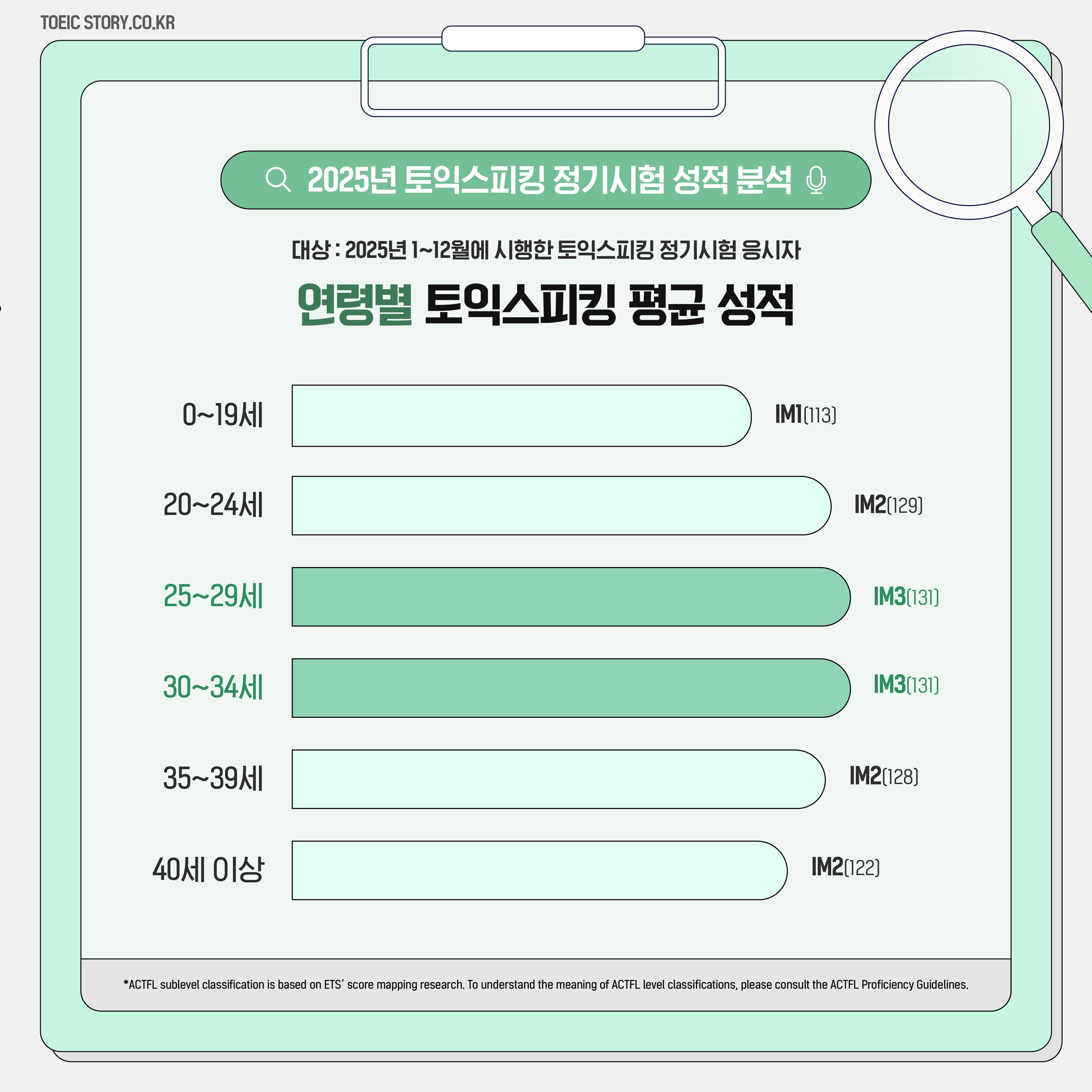 2025년 토익스피킹 연령별 평균 성적을 분석한 결과, ‘25~29세’와 ‘30~34’세는 ‘IM3’, ‘20~24세’와 ‘35~39세,’ ‘40세 이상’은 ‘IM2’, ‘19세 이하’는 ‘IM1’로 나타났습니다.