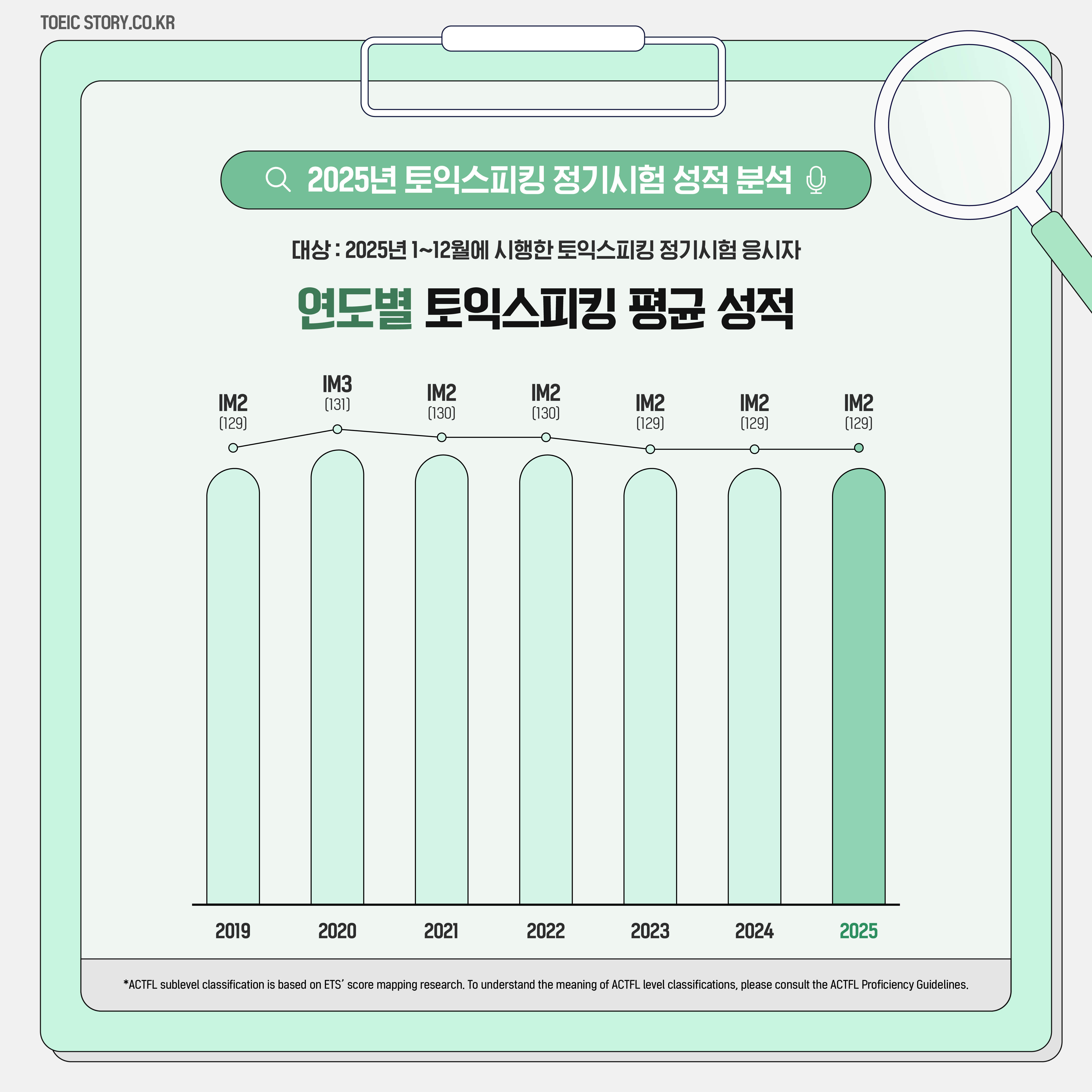 2025년 한 해 동안 토익스피킹 정기시험에 응시한 수험자들의 평균 성적은 ‘IM2(Intermediate Mid 2)’로 집계됐습니다. 이는 2024년과 동일한 수준으로, 토익스피킹 응시자들의 전반적인 역량이 큰 변동 없이 안정적인 흐름을 이어가고 있음을 보여줍니다.