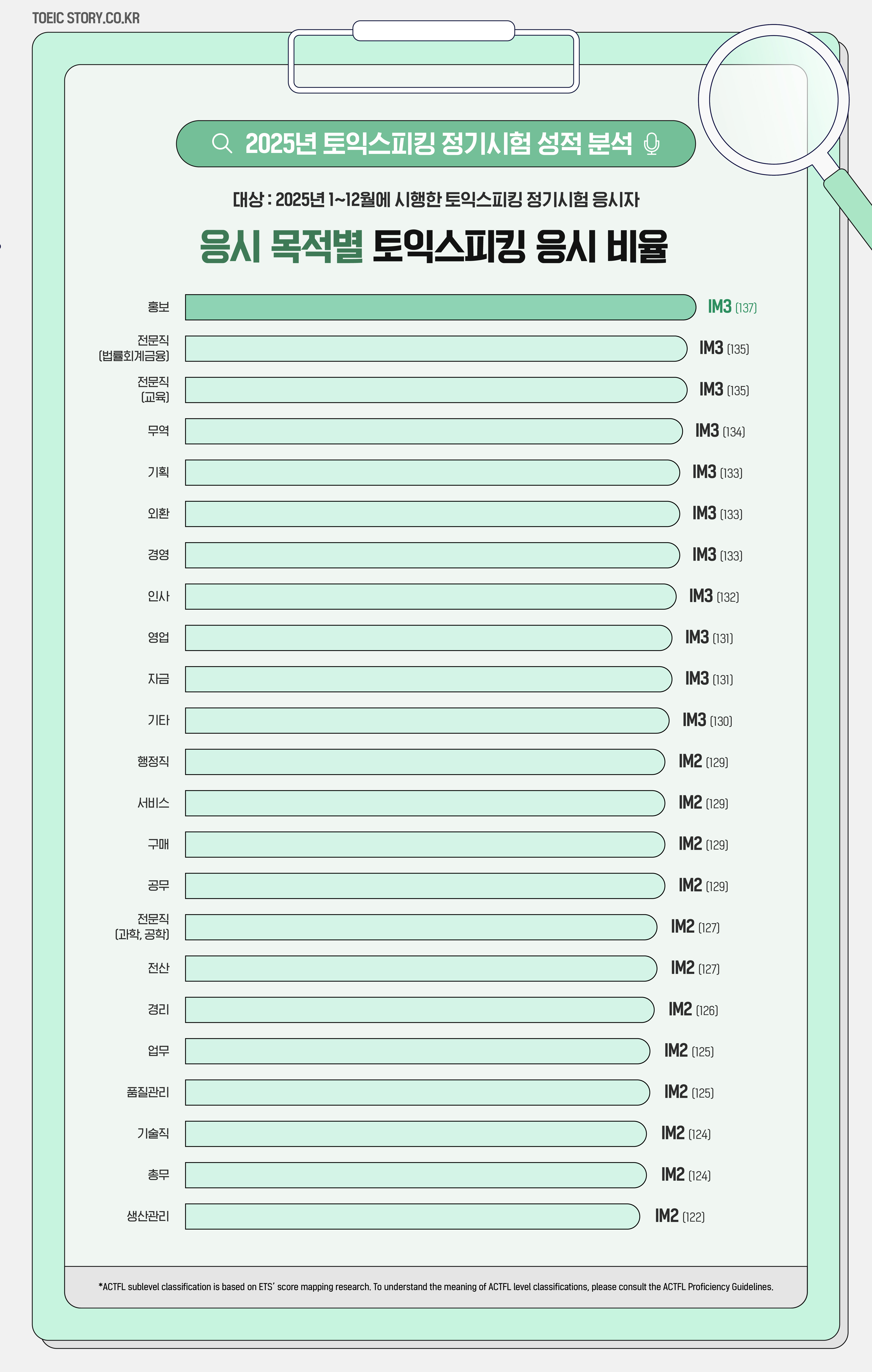 토익스피킹 업종별 평균 성적을 분석한 결과, ‘홍보’ 분야 수험생의 평균 성적이 ‘IM3(137점)’로 가장 높게 나타났습니다. 이는 2024년 1위를 차지했던 ‘전문직(교육)’을 제친 결과로, 홍보 직군의 영어 말하기 역량이 두드러지게 나타난 점이 눈에 띕니다.