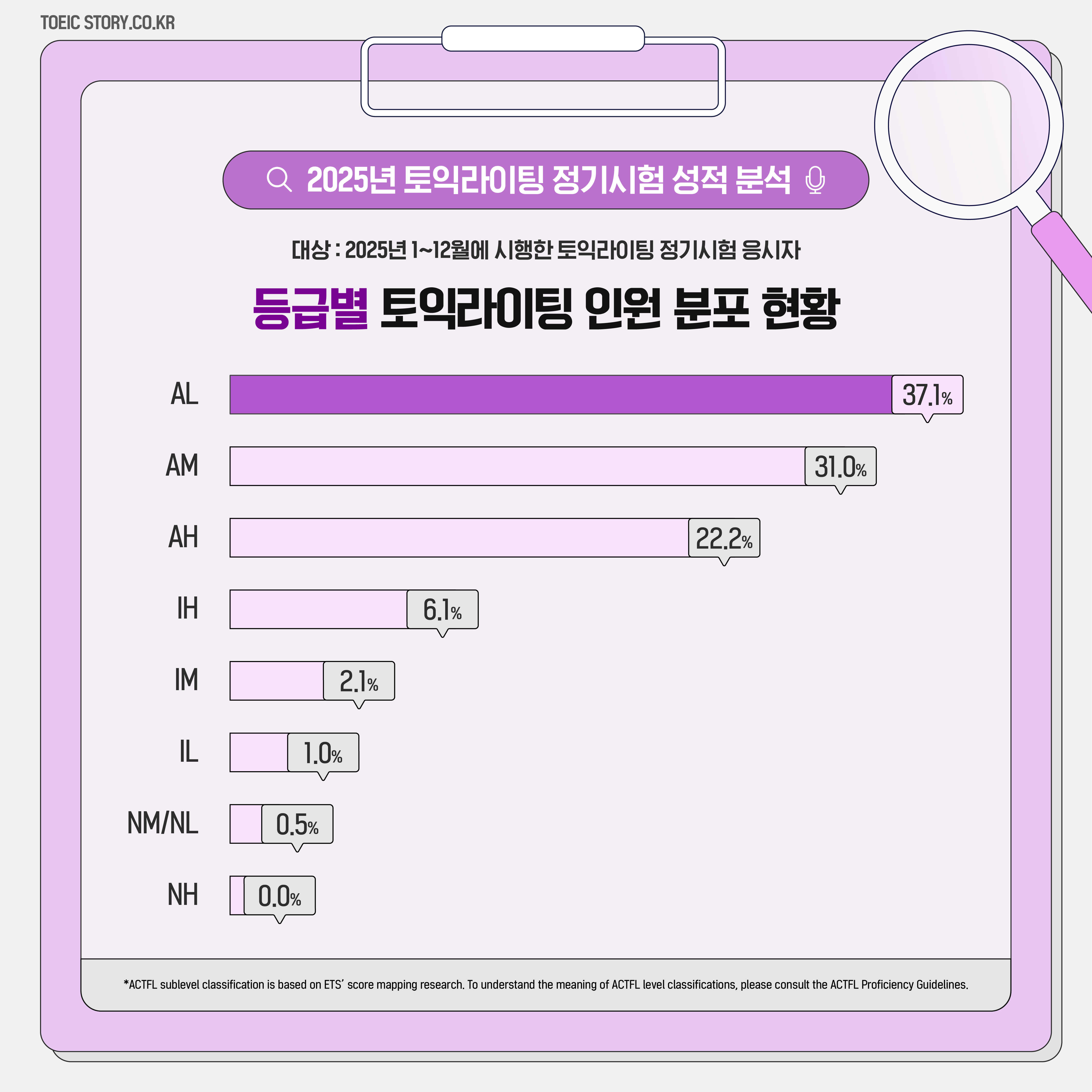반면 ‘IH(Intermediate High)’, ‘IM(Intermediate Mid)’, ‘IL(Intermediate Low)’은 한 자릿수 비율을 보였으며, ‘NM/NL(Novice Mid/Low)’과 ‘NH(Novice High)’는 각각 0.5%와 0.0%로 매우 낮은 수준에 그쳤습니다.