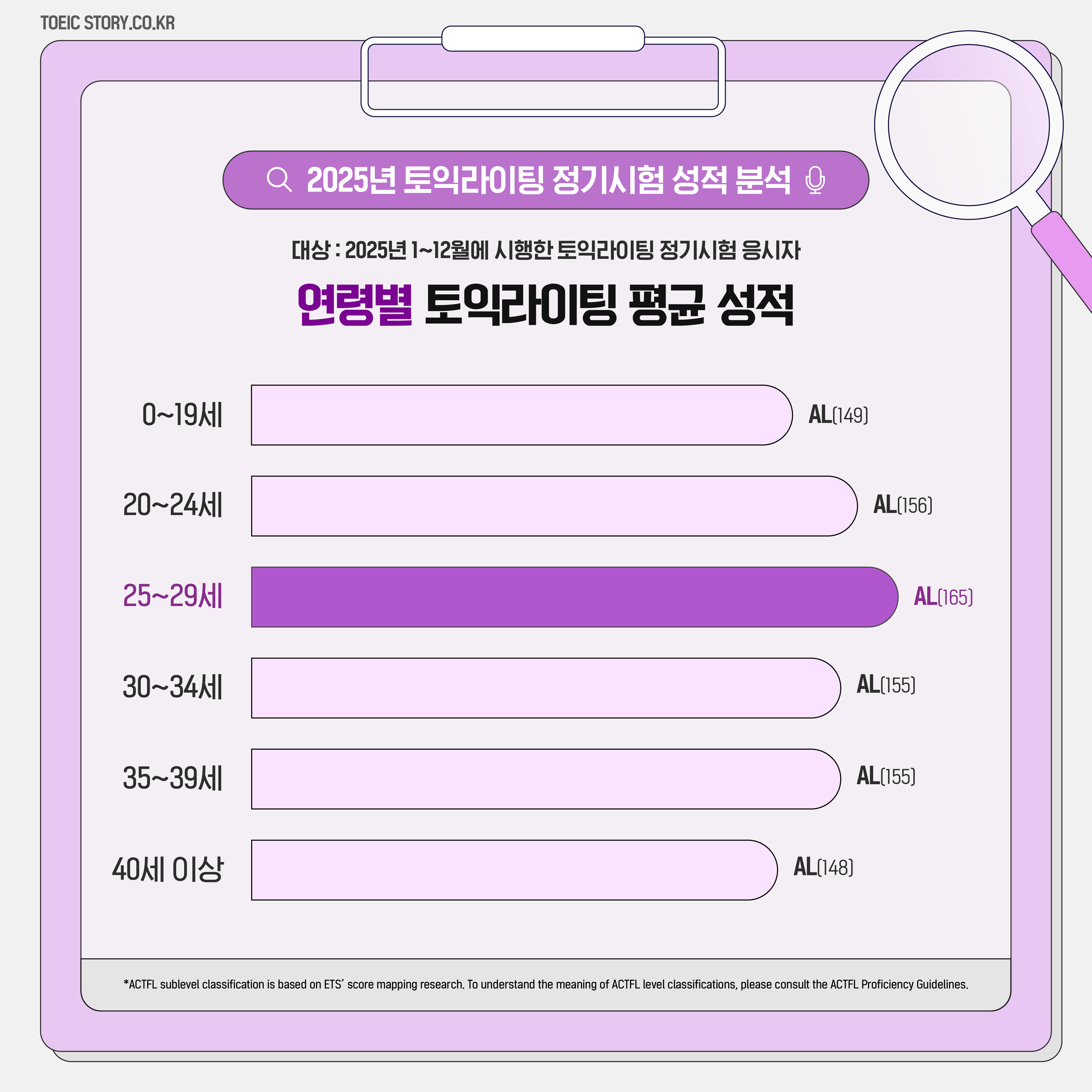 2025년 토익라이팅 연령별 평균 성적을 분석한 결과, ‘25~29세’가 165점으로 ‘AL’ 등급을 기록하며 가장 높은 수준을 기록했습니다. 이는 2025년 토익라이팅 전체 평균인 155점보다 10점 높은 수치이기도 하죠.