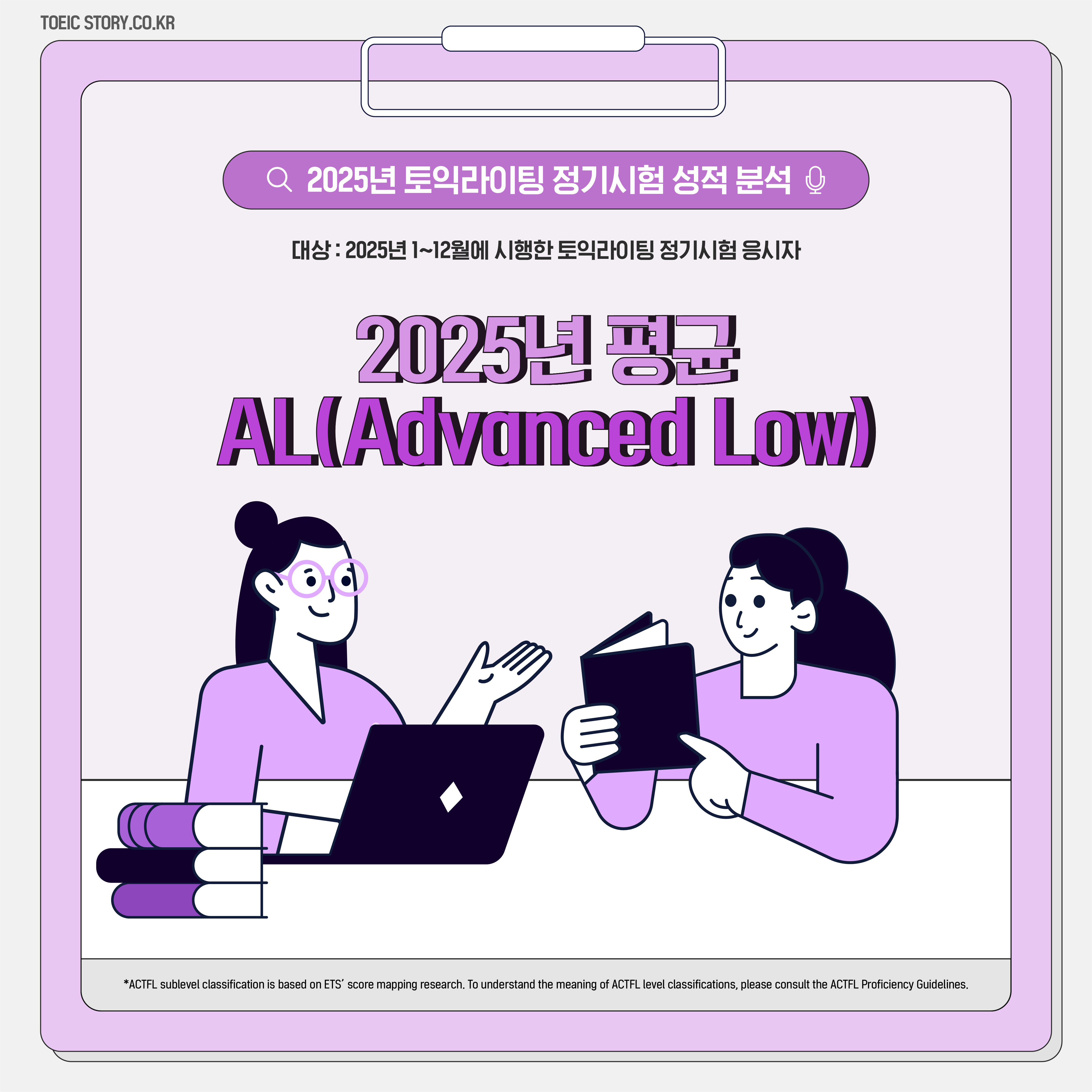 2025년 토익라이팅 정기시험에 응시한 수험자들의 평균 등급은 ‘AL(Advanced Low)’로 집계됐습니다. AL 등급은 간단한 정보를 제공하거나 질문·지시·요청을 할 때 명확하고 일관성 있게 글을 작성할 수 있는 수준을 의미합니다.