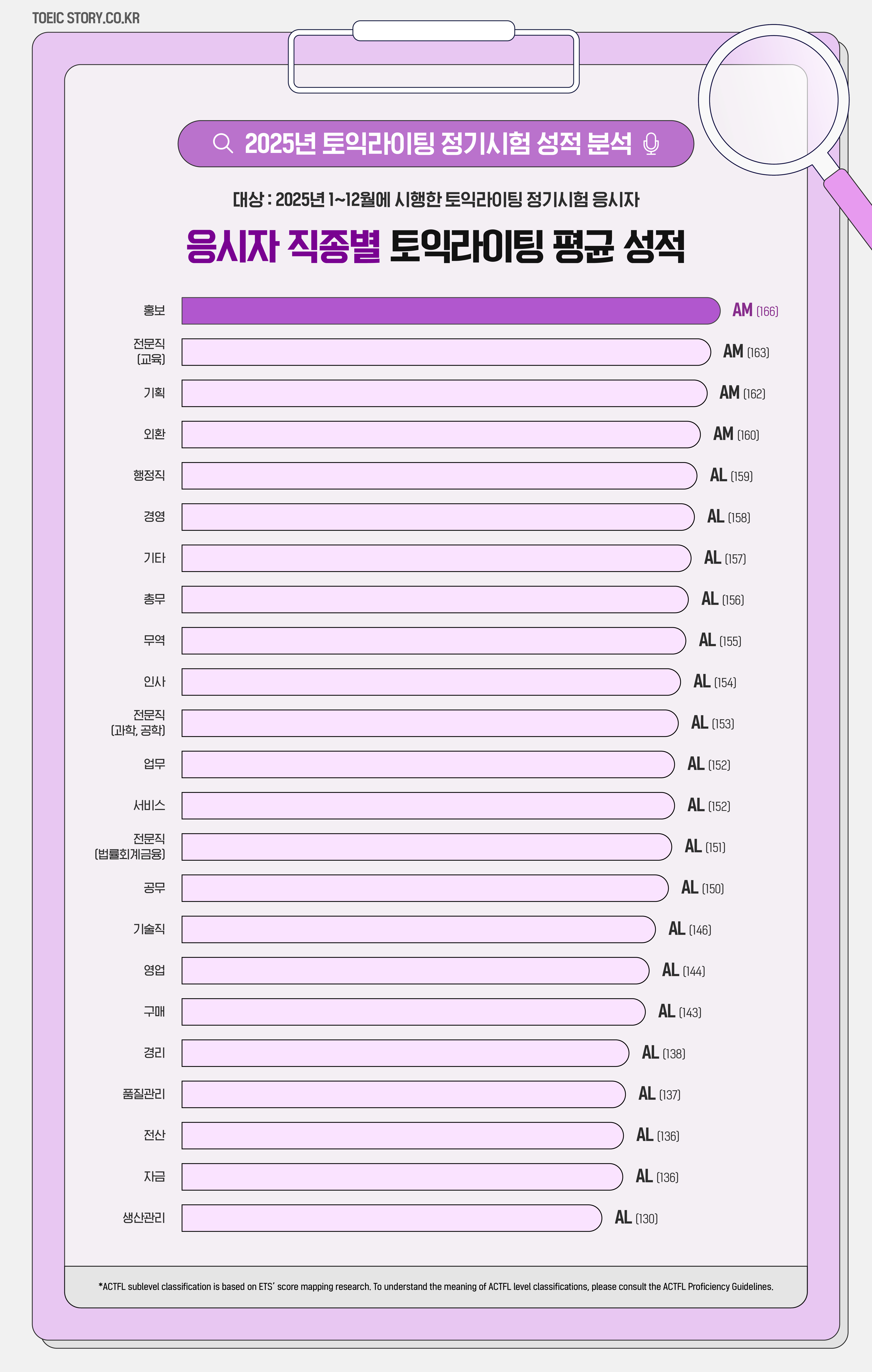 직종별 토익라이팅 평균 성적은 어떻게 나타났을까요? 분석 결과, ‘홍보’ 분야 수험자의 평균 성적이 166점으로 ‘AM(Advanced Mid)’ 등급을 기록하며 가장 높은 수준을 보였습니다.